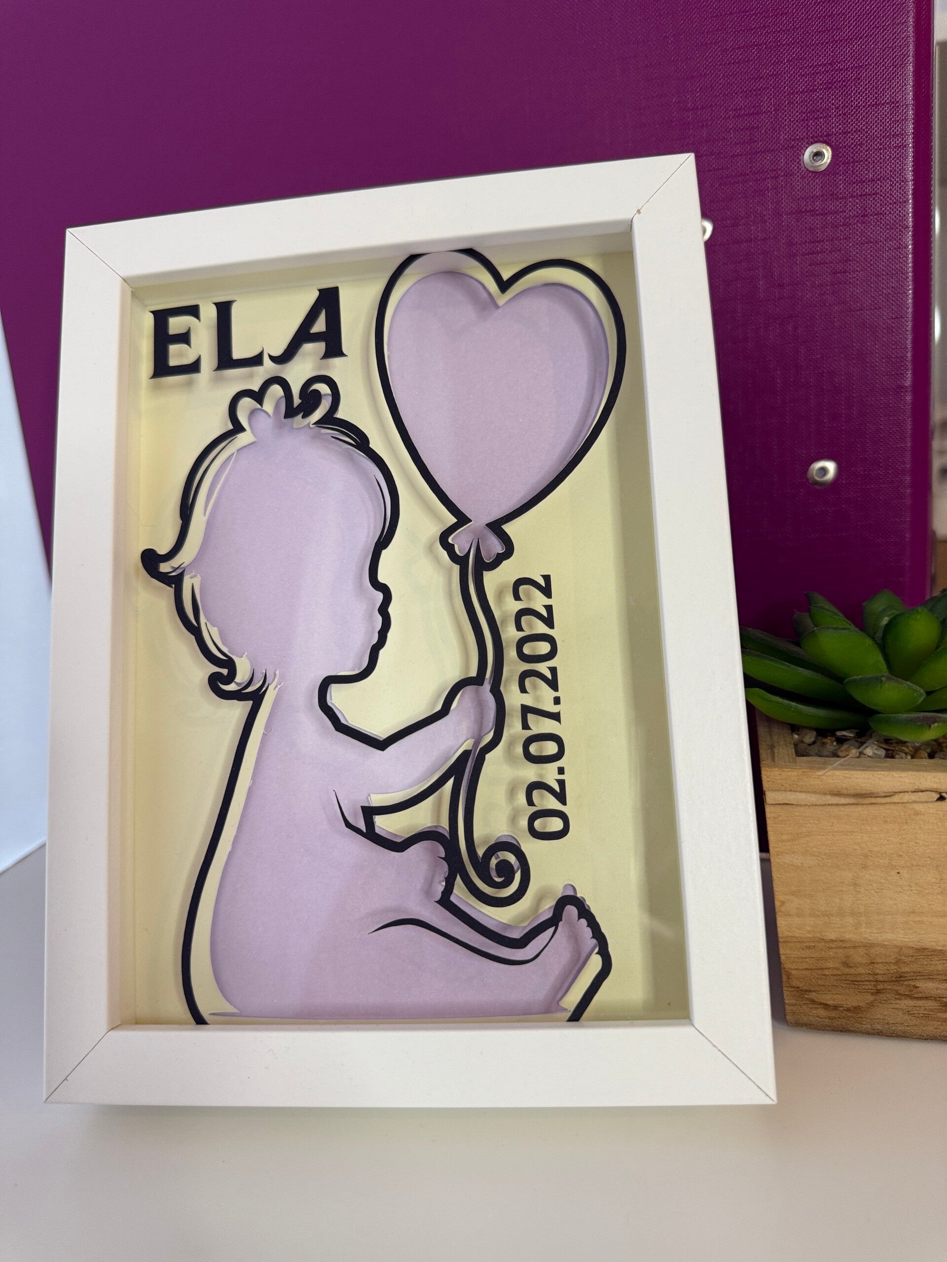 Dekorativer Tiefenrahmen mit liebevoll gestalteten Details - ideal für Namen, Daten oder kleine Botschaften.